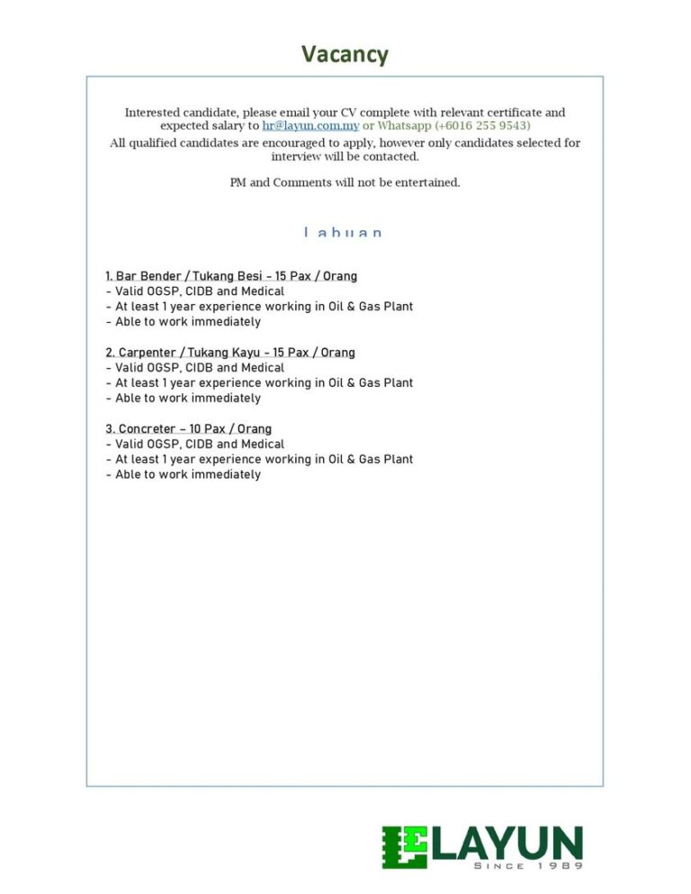 URGENT Vacancy LABUAN 1. Tukang Kayu – 15 Orang 2. Tukang Besi – 15 Orang 3. Concretor – 10 Orang KELAYAKAN SEPERTI BERIKUT : *OGSP , CIDB & Medical *KEMASUKAN SEGERA Sila hubungi melalui whatsapp +6016 255 9543 PM and…